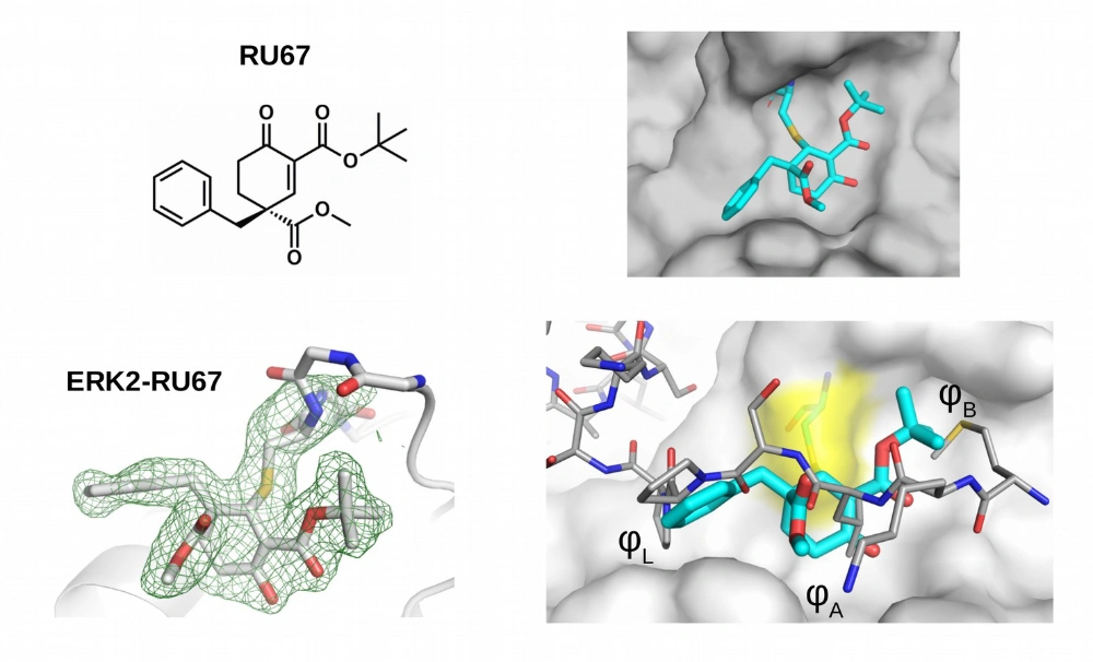 RU67 (in cyan in the right panels) binds to the MAPK D-groove cysteine (C161, in yellow, located in the central position of a shallow surface area comprised of small hydrophobic pockets; φL,A,B) and blocks peptide binding (right bottom panel show the overlay of a MAPK–D-peptide, in gray, and the MAPK-RU67 crystal structures).
