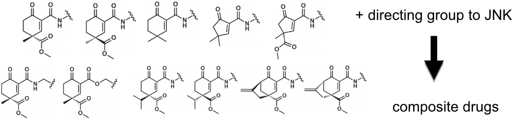 Different cyclopentenone/cyclohexenone based warheads can be added to known directing groups (DG; e.g., a noncovalent moiety known to bind to the ATP-pocket of JNK) and the latter will “guide” the warhead to specific proteins and to specific sites. A reversible covalent bond to a nearby nucleophile (cysteine or histidine) will increase the binding affinity and more importantly will increase residence time.