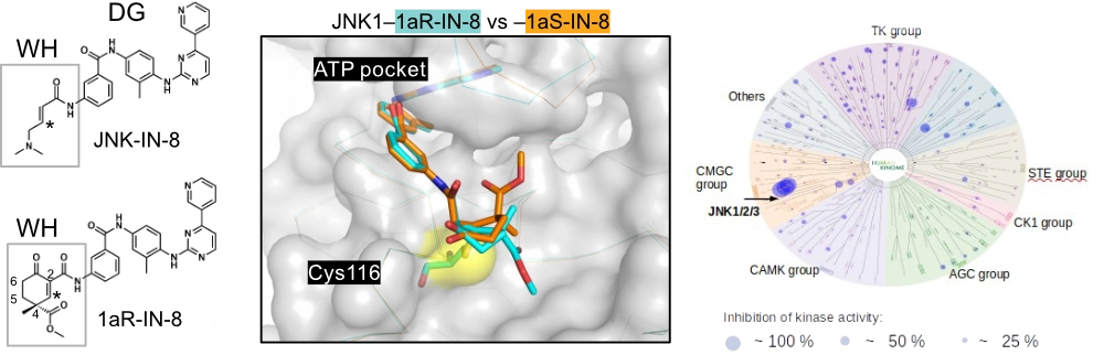 The new composite JNK inhibitors have a cyclic warhead with a stereogenic center at C4. This allows the positioning of the substituent groups differently which is important to achieve great JNK isoform selectivity.